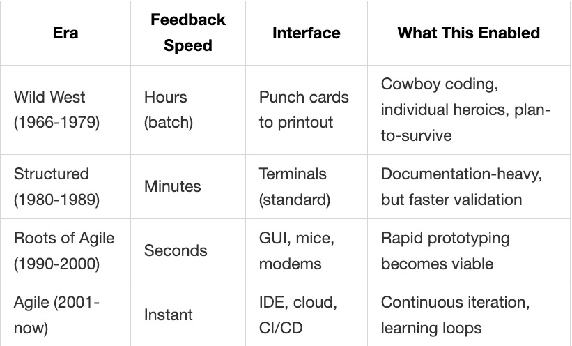 In 2001, seventeen developers met at a ski resort in Utah and wrote the Agile Manifesto. It gets romanticized as a revolutionary moment, but really, it was formalizing what the economics had already made possible. The 90s showed that fast feedback enabled iterative work. The Manifesto gave it a name and a set of principles.